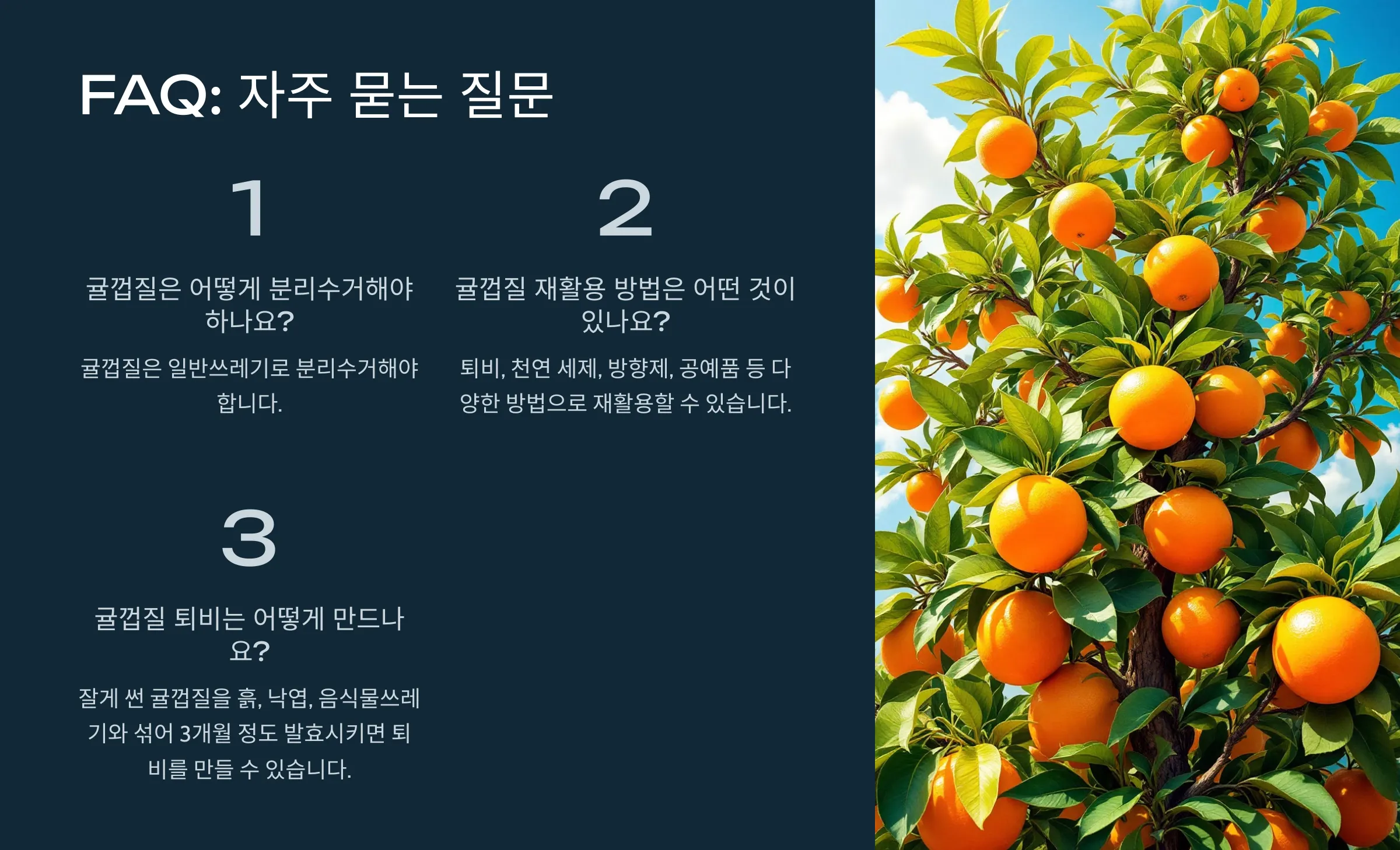 귤껍질을 음식물 쓰레기로 처리할 수 있는 경우에는 깨끗하게 씻은 후 배출하면 좋아요. 반대로 일반 쓰레기로 버려야 하는 경우에는 비닐봉투에 담아 배출해야 해요. 이런 작은 실천이 환경 보호와 재활용 활성화에 큰 도움이 된답니다.