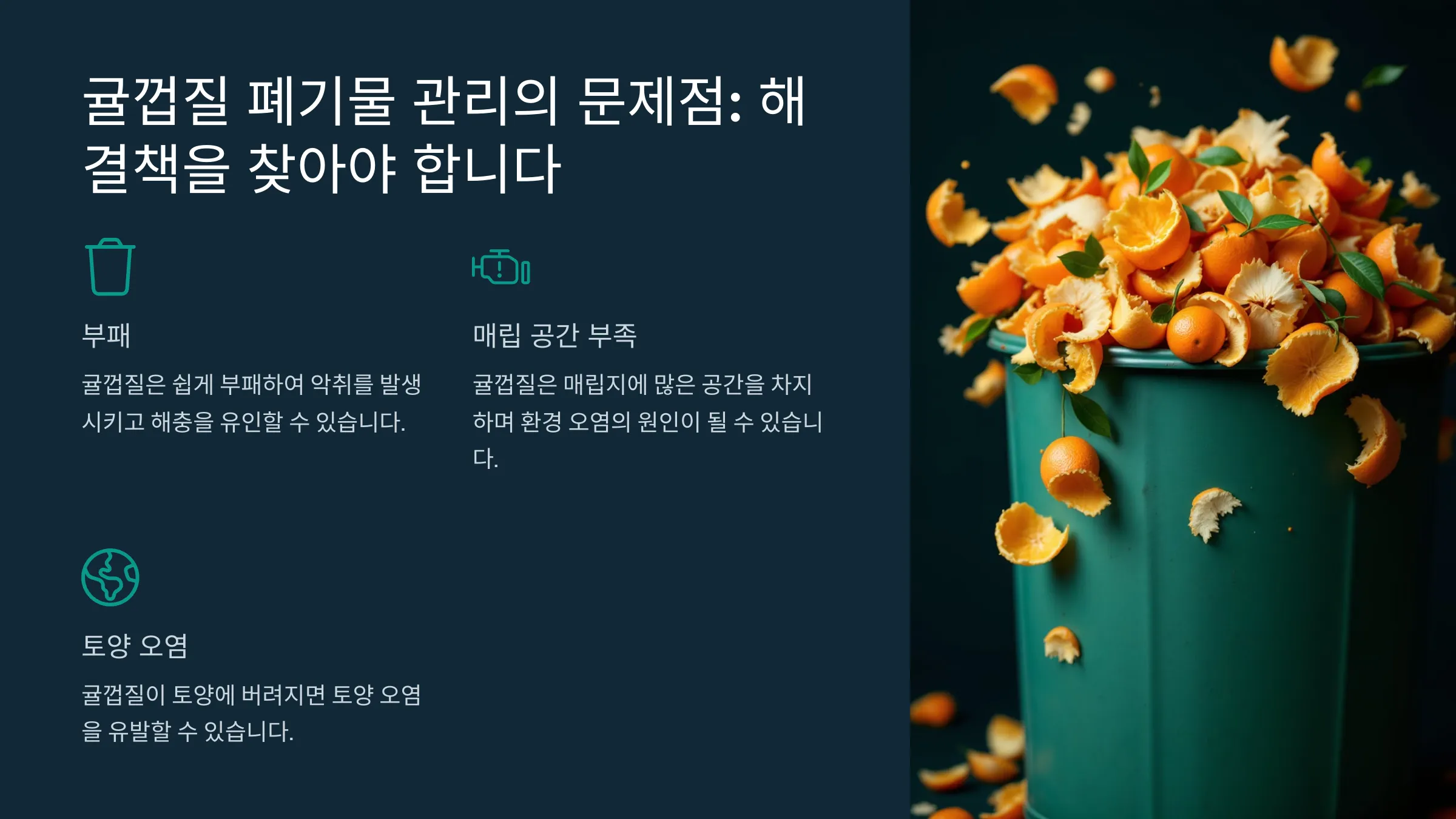 귤껍질은 재활용 가능성이 높지만, 잘못된 처리로 인해 폐기물 문제가 발생할 수도 있어요. 음식물 쓰레기로 버려야 할 귤껍질을 일반 쓰레기로 처리하거나, 반대로 일반 쓰레기로 처리해야 할 귤껍질을 음식물 쓰레기로 버릴 경우 문제가 생길 수 있어요.