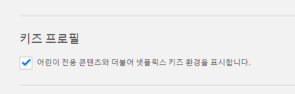 자녀 보호 설정으로 들어가면 아래처럼 체크박스가 나오고 체크를 하시면 어린이 프로필이 설정이 됩니다. 어린이 프로필을 설정함으로써 자녀는 연령에 맞는 콘텐츠를 자연스럽게 즐기게 되며, 부모는 더 이상 자녀의 시청 내용을 계속해서 확인할 필요가 없을 정도로 안전하게 관리할 수 있습니다.