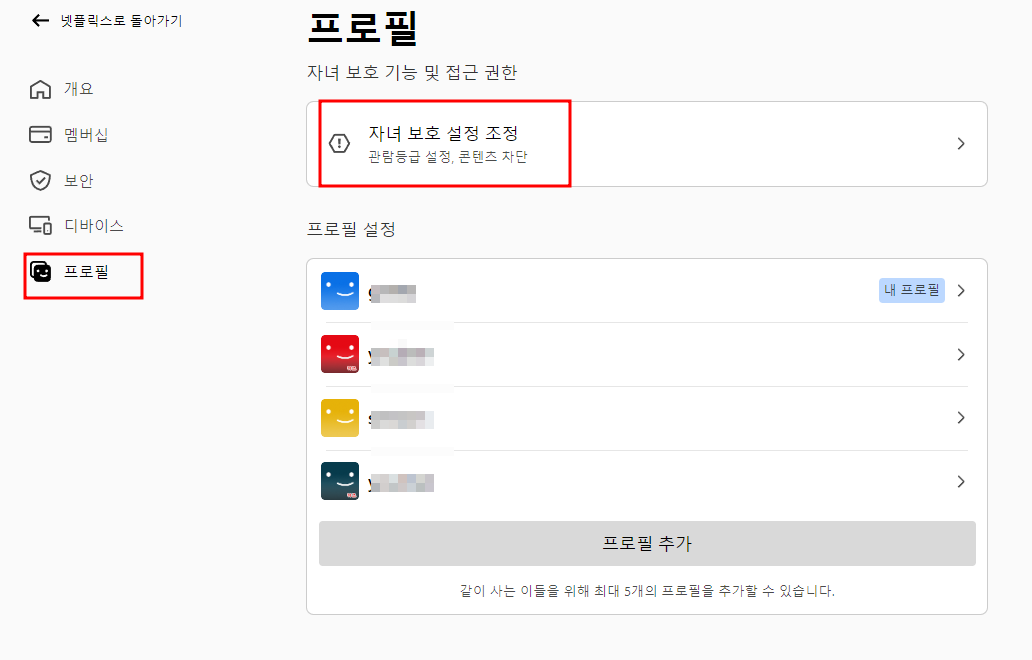 - 계정 메뉴에서 프로필 및 자녀 보호(Profile & Parental Controls) 옵션을 찾습니다.