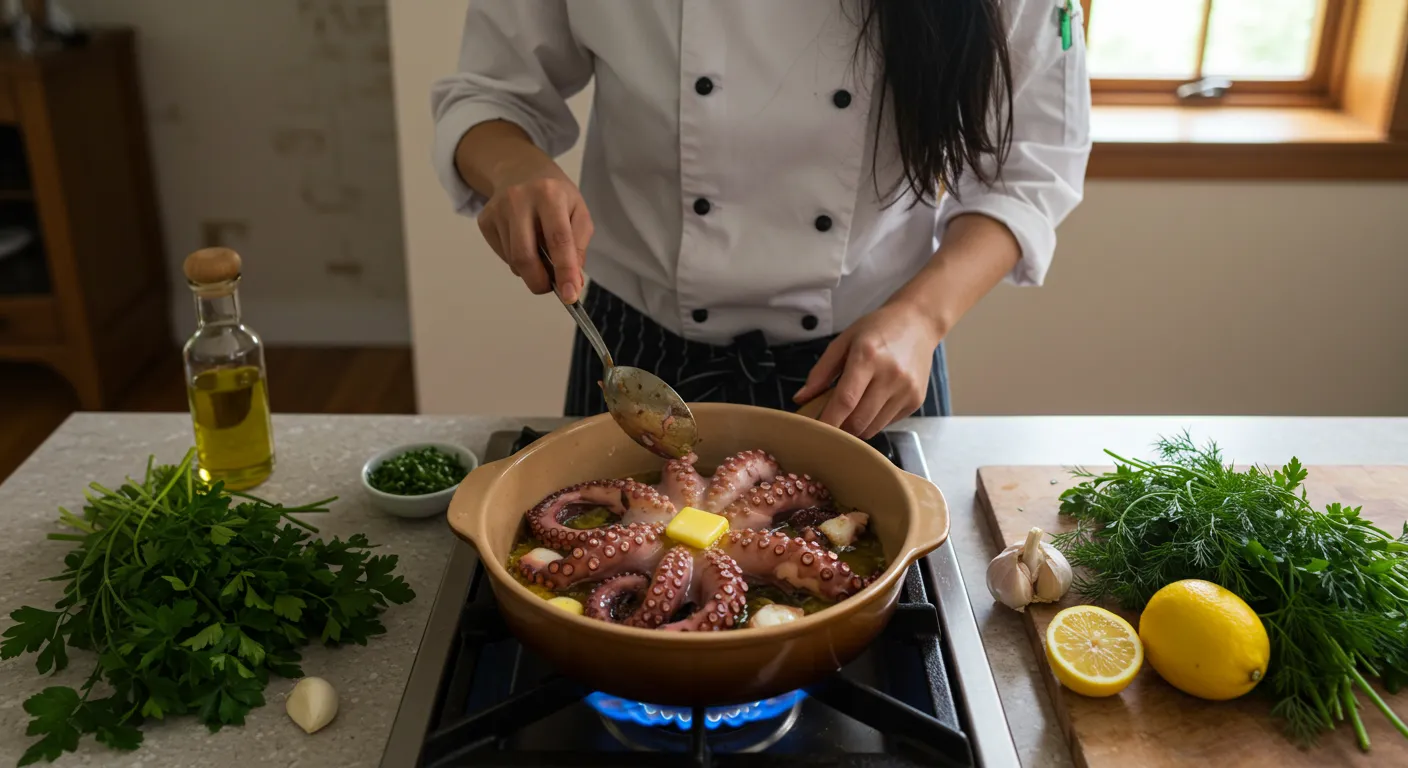 - 문어, 올리브오일, 허브(로즈마리, 타임), 레몬즙