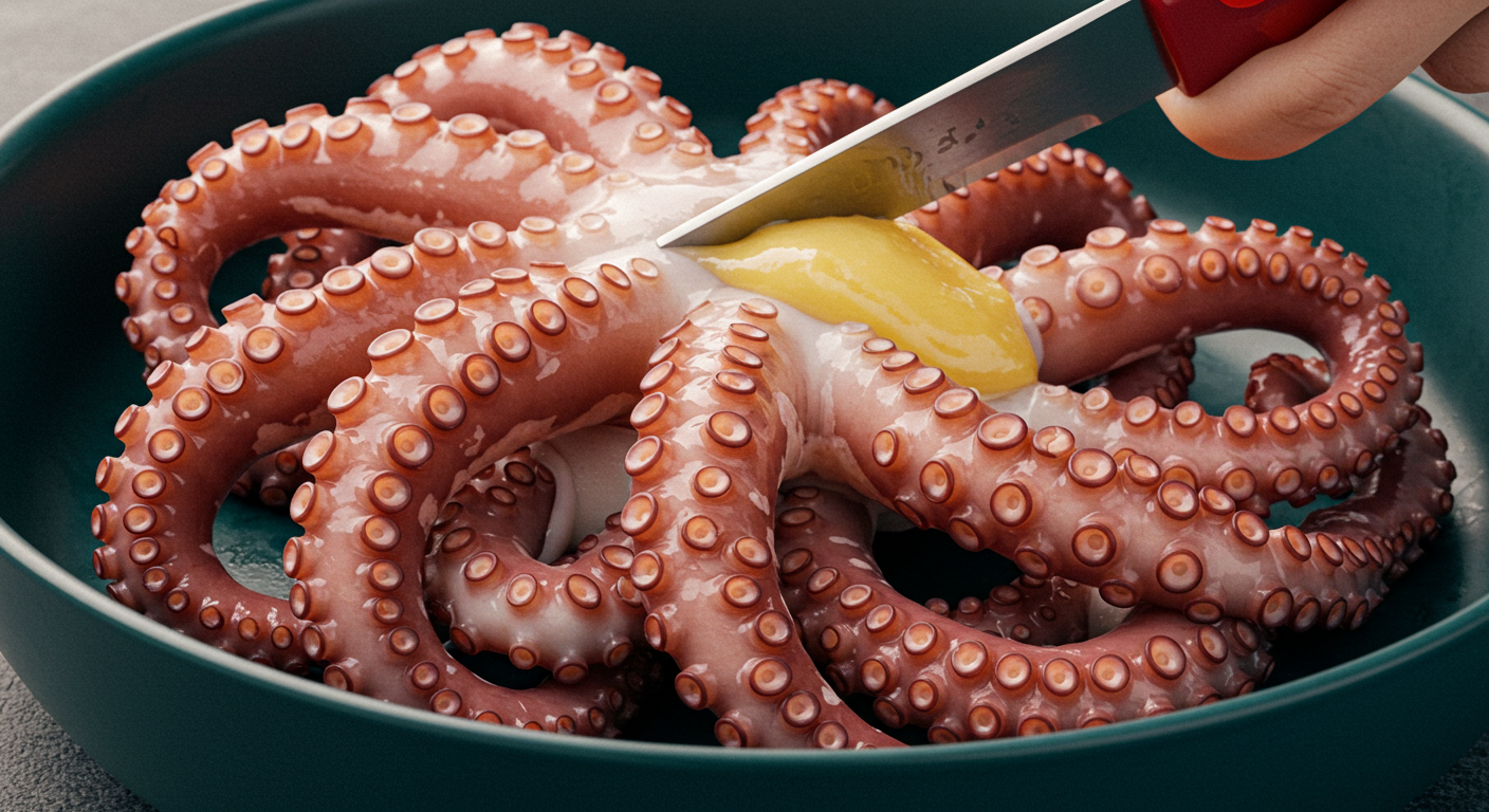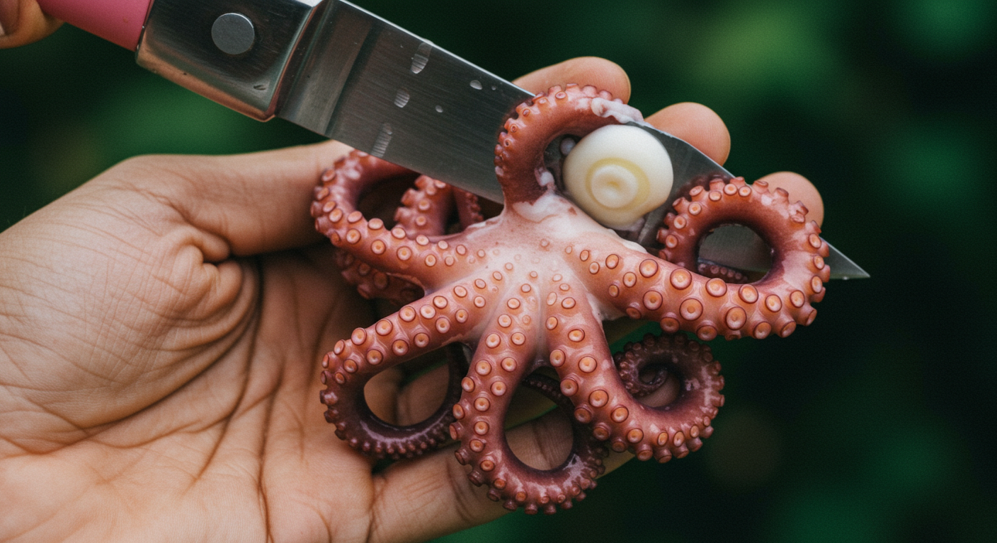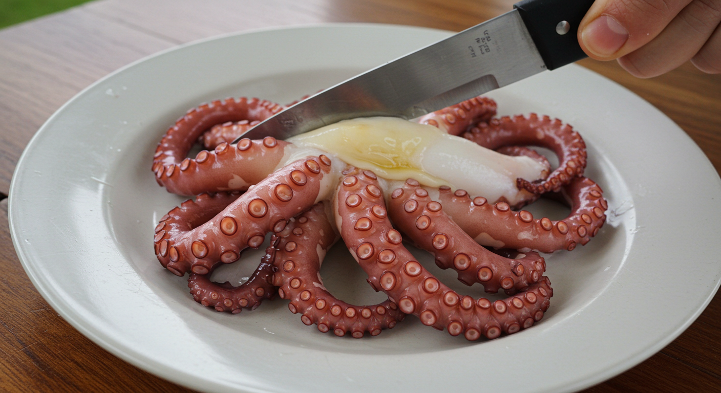 - 문어의 머리 부분을 뒤집으면 내장이 보입니다. 이 방법은 내장을 손쉽게 제거할 수 있도록 돕습니다.