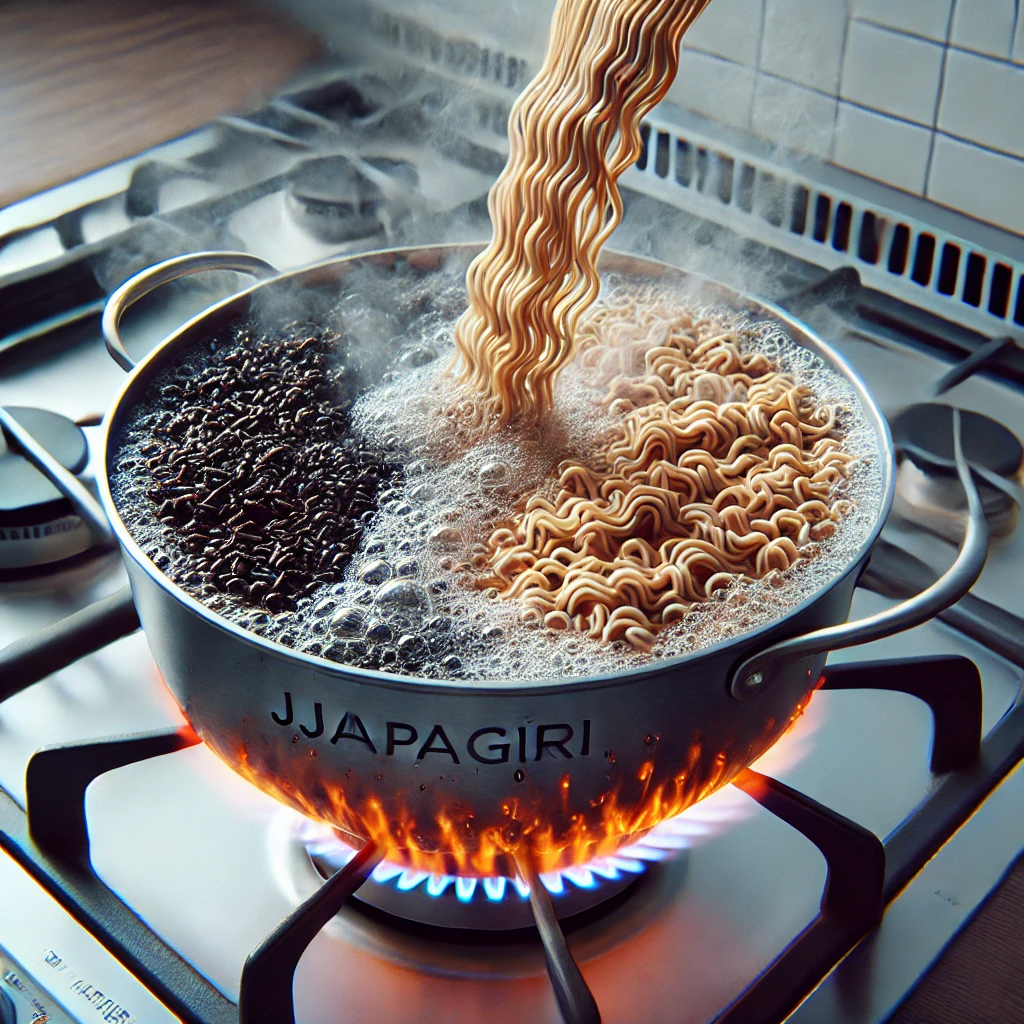 - 물 600ml를 먼저 끓입니다. 물이 끓기 시작하면 짜파게티와 너구리 라면을 동시에 넣고 면이 적당히 익을 때까지 약 4분간 끓입니다.