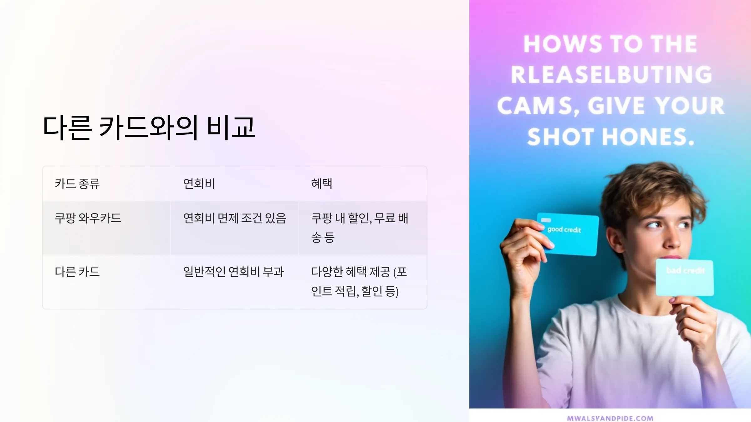 또한, 연회비 측면에서도 쿠팡 와우카드는 다른 카드에 비해 상대적으로 저렴하거나 면제받기 쉬운 조건을 제공해요. 카드사에 따라 제공되는 제휴 혜택도 다르기 때문에, 본인의 소비 패턴에 맞는 카드를 선택하는 것이 중요해요.