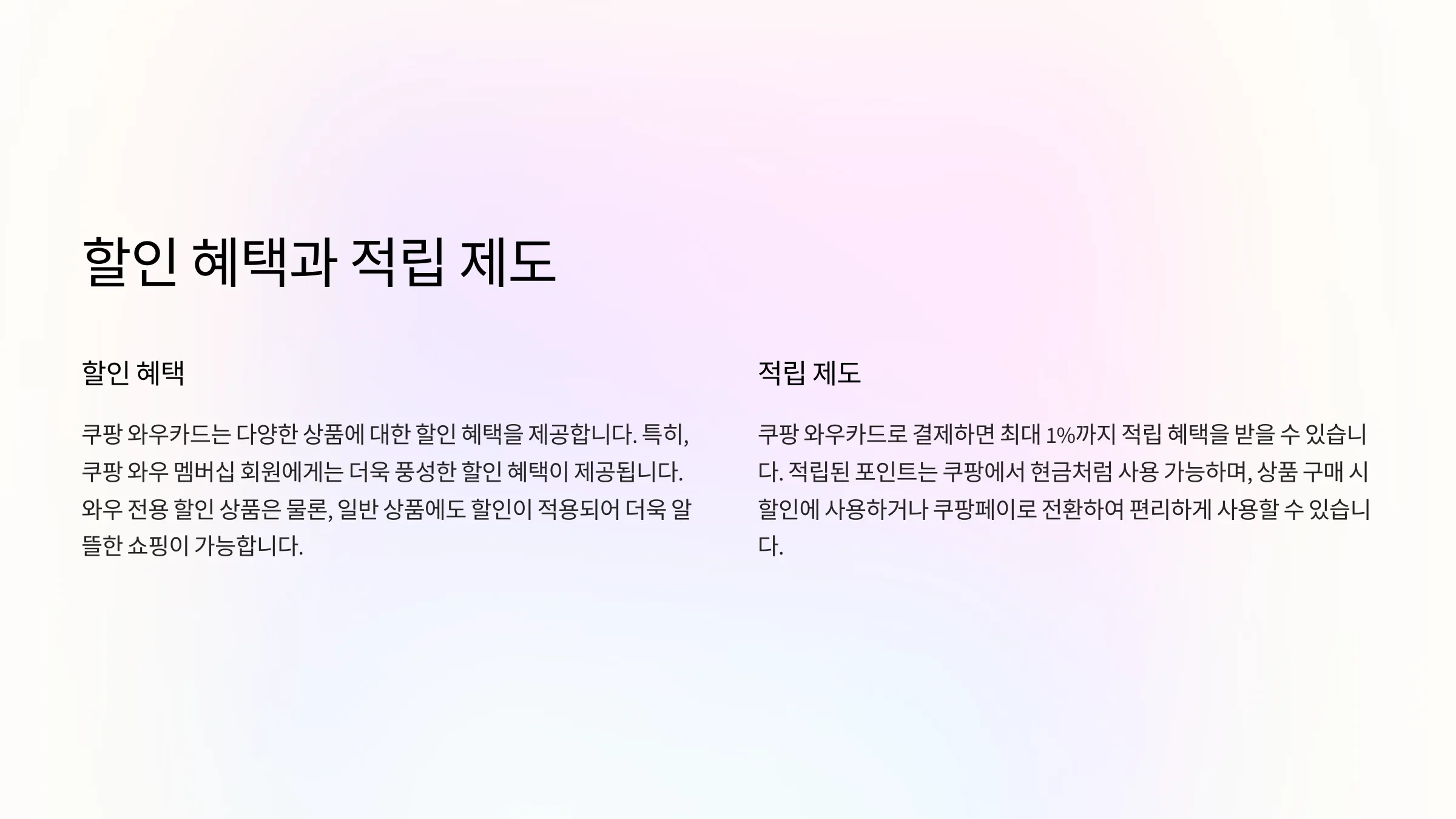 쿠팡 와우카드의 가장 큰 매력은 쇼핑 할인과 적립 제도예요. 쿠팡에서 결제 시 일정 비율로 할인 혜택을 받을 수 있거나, 적립금이 쌓이는 구조로 되어 있어요. 적립금은 추후 쿠팡 내에서 현금처럼 사용할 수 있어서 실질적인 혜택을 체감하기 쉬워요.