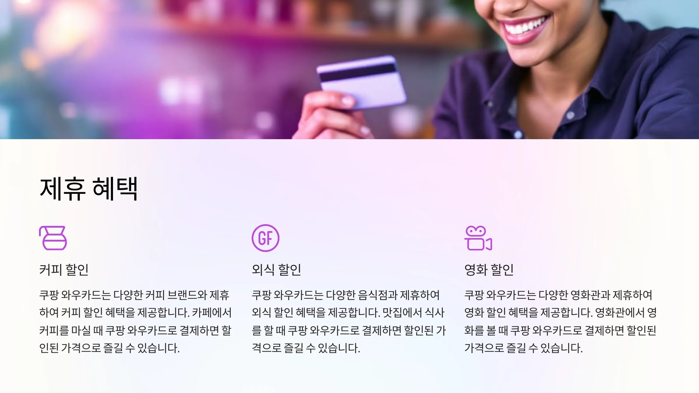 쿠팡 와우카드는 쿠팡 내 혜택 외에도 카드사와 연계된 다양한 제휴 혜택을 제공해요. 대표적으로 영화 할인, 외식 업종 할인, 주유소 포인트 적립 등이 있어요. 이런 제휴 혜택은 쿠팡 외의 소비에서도 추가적인 가치를 제공하기 때문에 일상생활에서의 활용도가 아주 높답니다.