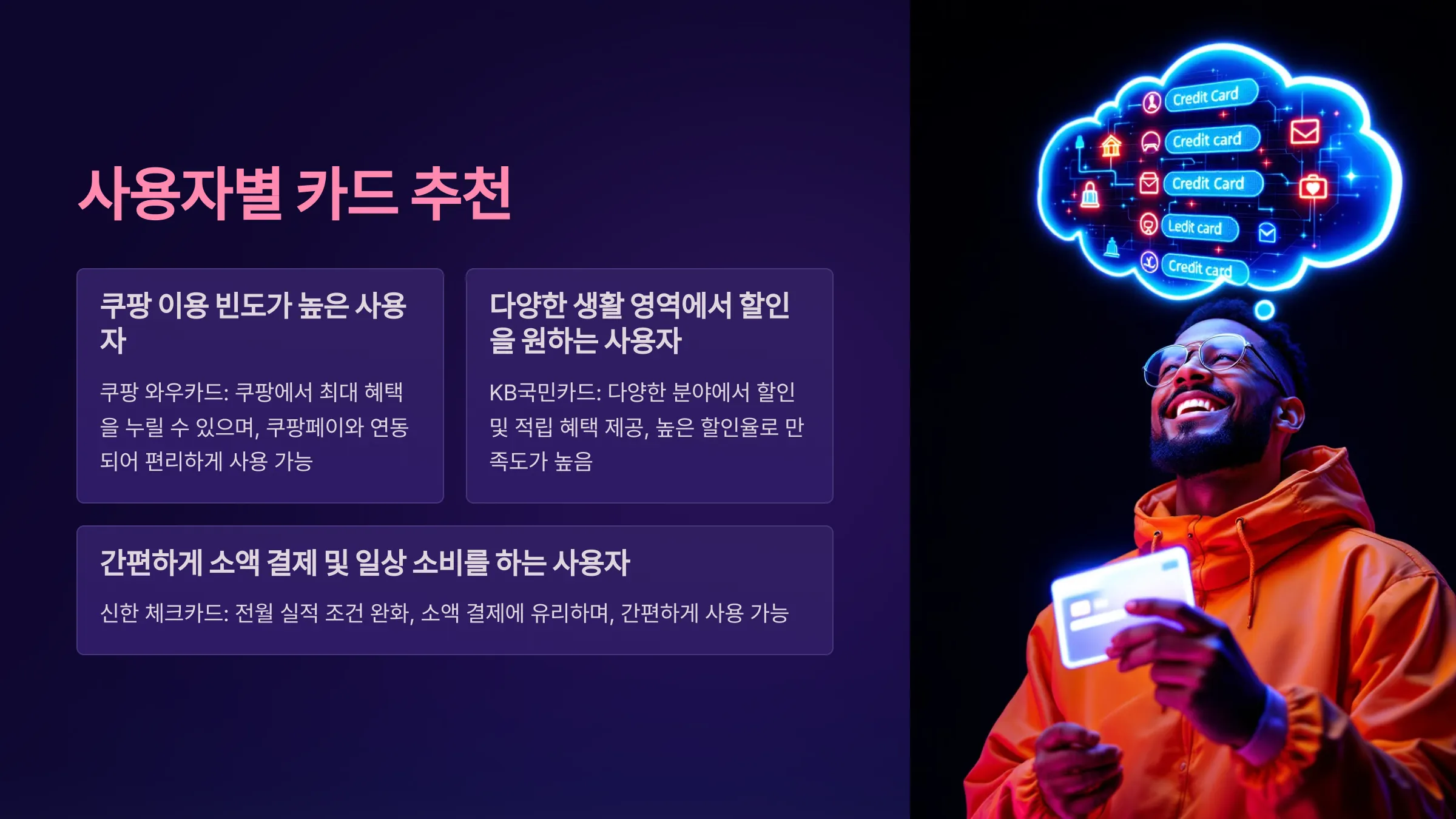 | 쿠팡 와우카드 | 쿠팡캐시로 적립, 쿠팡, 쿠팡이츠, 쿠팡플레이에서 현금처럼 사용 가능. 전월 실적 조건 없음. |