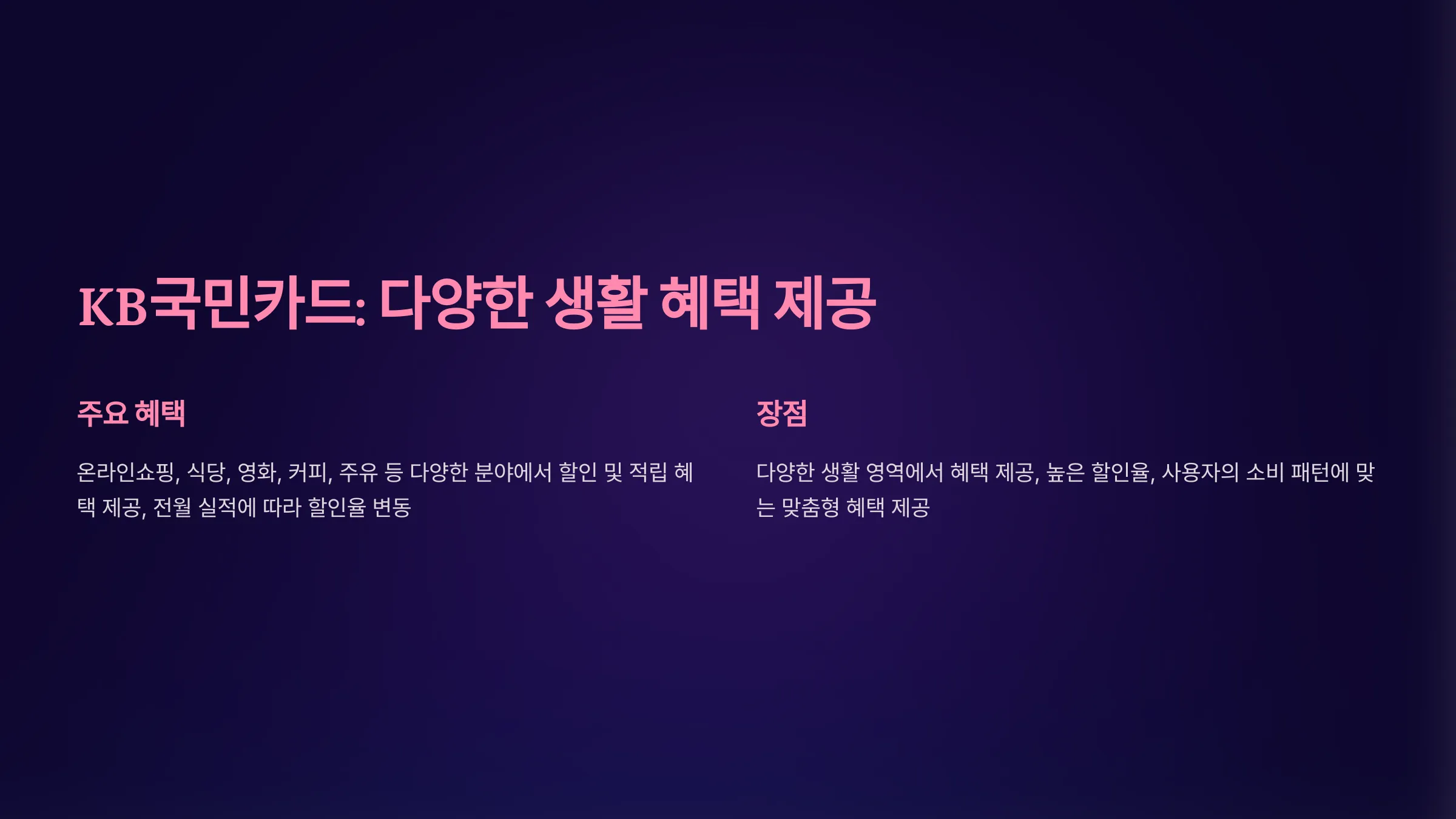 | KB국민카드 | 주요 가맹점 할인, 영화 티켓 할인 등 다양한 생활 혜택. |